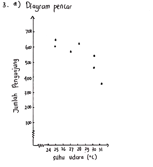 3. Seseorang melakukan penelitian tentang pengaruh suhu udara terhadap jumlah pengunjung suatu taman wisata. Selama sepekan, ia mencatat suhu udara pada siang hari dan jumlah pengunjung di taman wisata tersebut dalam bentuk tabel berikut ini.